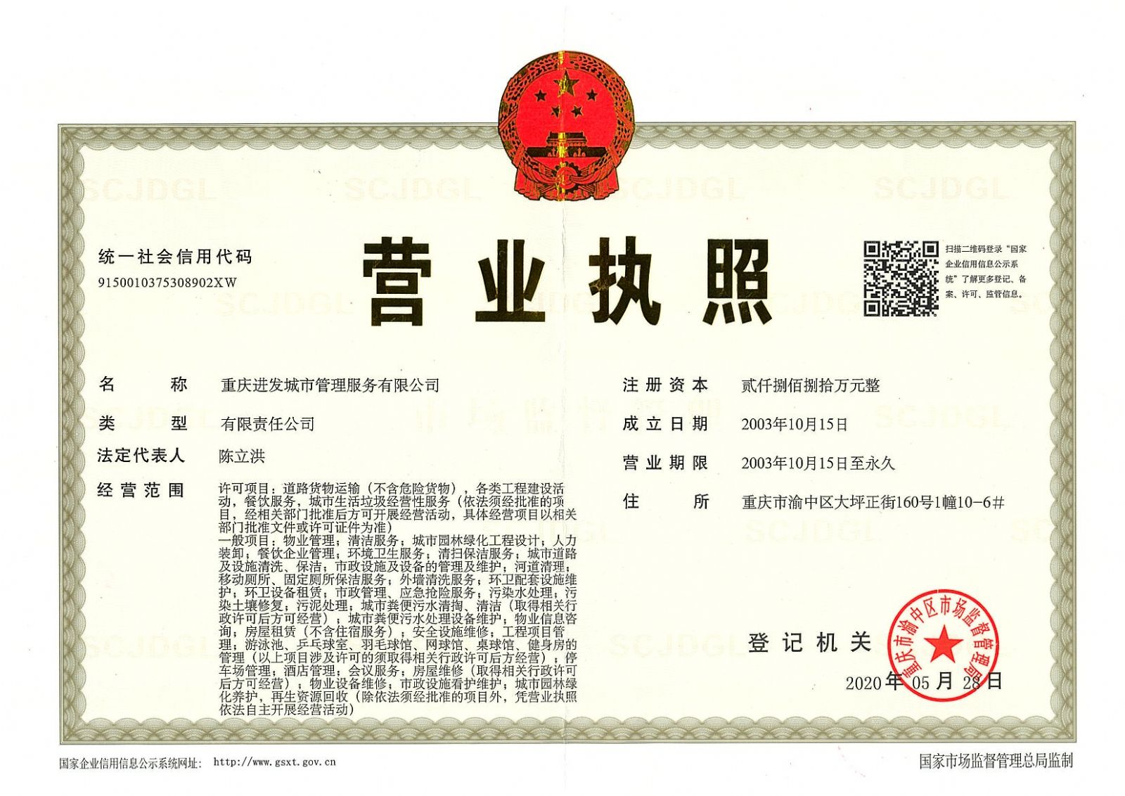 ? ? 重慶進(jìn)發(fā)城市管理服務(wù)有限公司(原名重慶進(jìn)發(fā)物業(yè)管理有限公司),成立于2003年10月,注冊(cè)資金2880萬元,位于重慶市渝中區(qū)大坪正街160號(hào)10-6,主要從事住宅、商住樓、寫字樓、商業(yè)、政府辦公樓、學(xué)校等各類型大樓的物業(yè)管理服務(wù)以及城市道路環(huán)境衛(wèi)生管理服務(wù)。